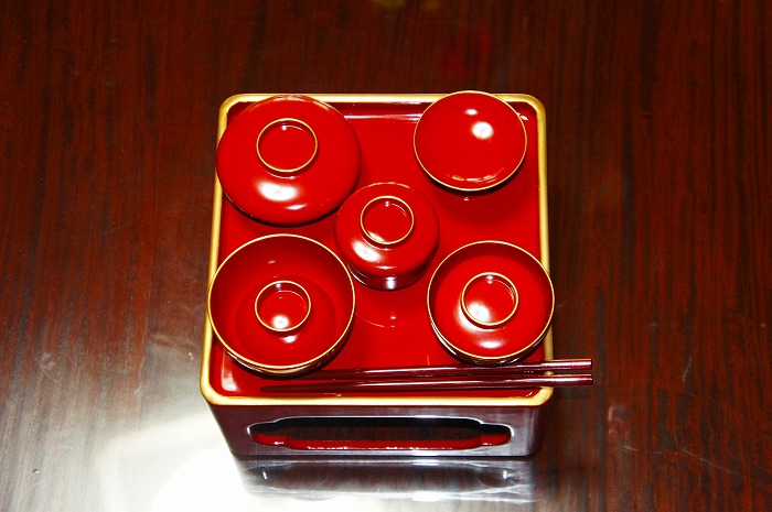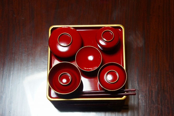 お仏壇にお供えするときは、ご先祖様に召し上がって頂きますので、「お箸をお仏壇の方に向けて」お供えします。また、「お膳」に「家紋」が入っている場合は、「家紋が自分たちに見えるように」お供えします。