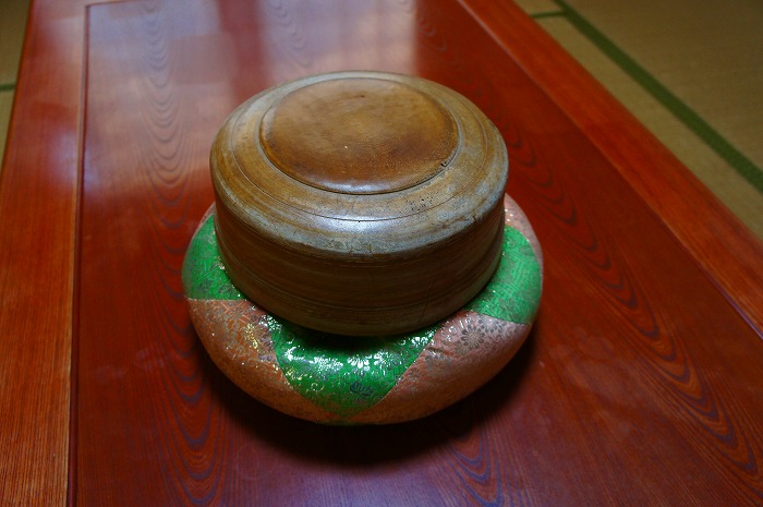 下の写真のように、木魚や木鉦を「ふとん」に乗せることがありますが、木魚や木鉦と同じ大きさの「ふとん」だと叩いているうちに、ズレて落ちてしまうことがありますので、1回りか2回りほど大きい「ふとん」を用意して下さい。