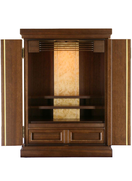 家具調仏壇(下の写真参照)は、現代建築(洋間など)に合うように作られた仏壇で、現在では様々なデザインの物が作られています。「御本尊」「仏さま」「ご先祖様」をお祀りする場所がお仏壇ですので、このようなお仏壇でも問題ありません。ただし、その性質上(コンパクト、現代的など)、「宮殿造り」という装飾が施されていない物が多いようです。