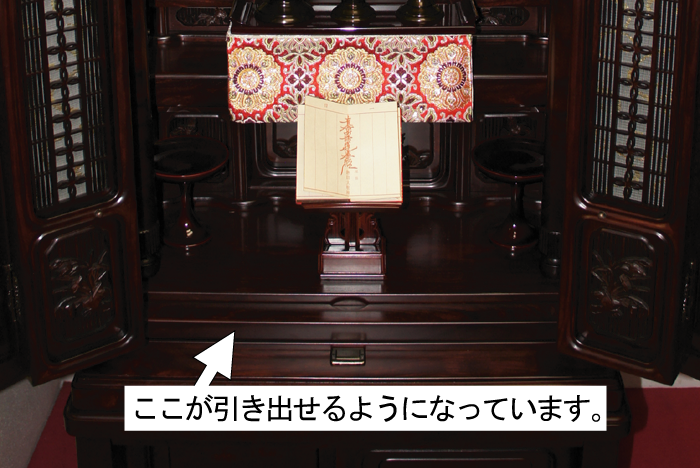 霊供膳は、毎日というのは大変ですが、年回(法事)・お盆・お彼岸・お正月にはご用意して頂きたいと思います。出来れば毎月一度、月命日にお供え頂けるとなお良いです。置く場所としては、お仏壇の最下部にある引き出し(上の写真矢印部)を出して置くのが一般的に思われます。