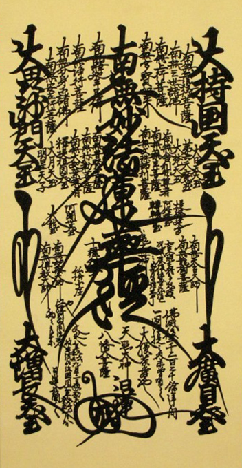 久遠実成(くおんじつじょう)のお釈迦さまの「慈悲」と「智慧」の詰まった「法華経」というお経の世界観を、日蓮聖人自らが文字にして顕されたものです。「南無妙法蓮華経」というお題目を中心に、法華経に出てくる仏さま・菩薩さま、法華経の信仰者を守護する諸天善神などのお名前が記されています。