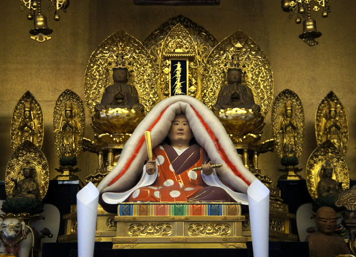 お題目の記された宝塔の左右に「お釈迦さま」と「多宝如来さま」がお座りになっている様子を表したお像です。