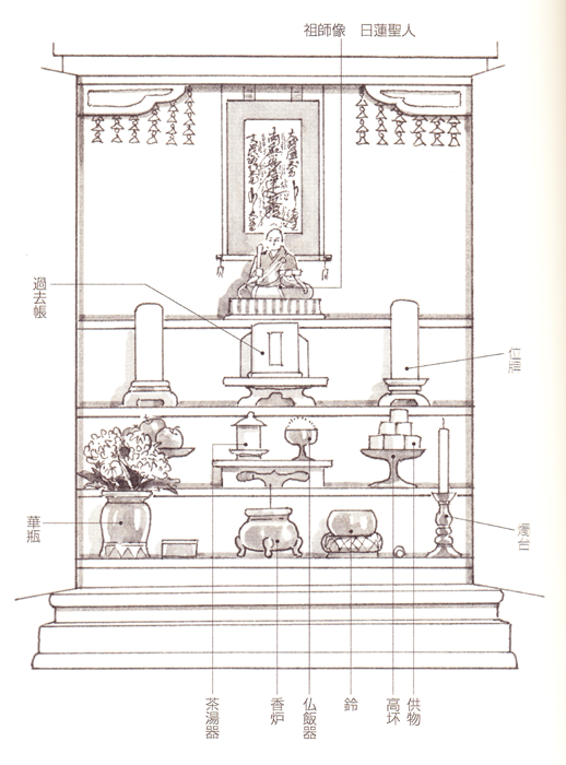 以下では、「京型」のお仏壇(左側写真)での祀り方を中心に説明していきます。なお、日蓮宗の推奨している置き方(右側図)とは、お仏壇の形が違いますので、異なります。