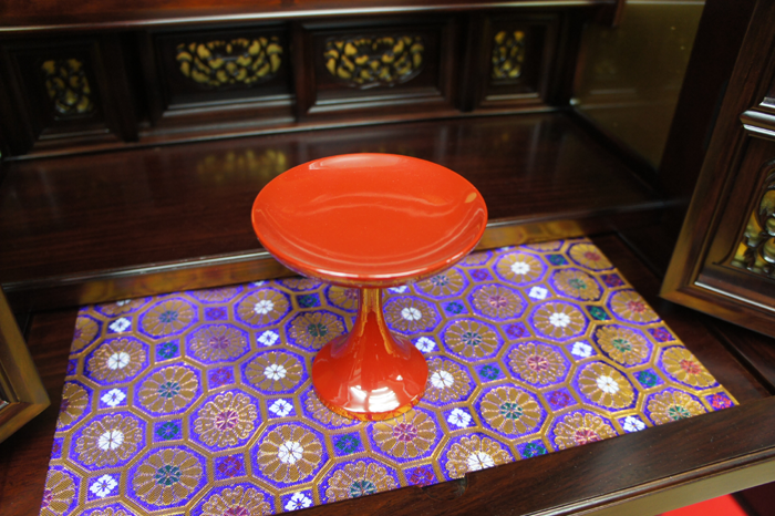 ⑨の高坏は、上の写真の位置に置くか、その一段上(お位牌の一段下)に置いて下さい。お位牌が多い場合は、その段にもお位牌を置かれていることが多いので、写真のように置かれているのをよくお見かけします。