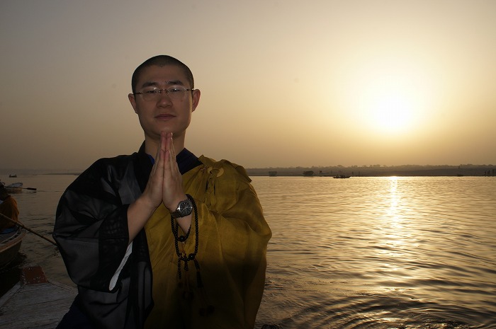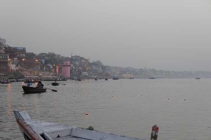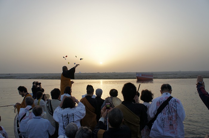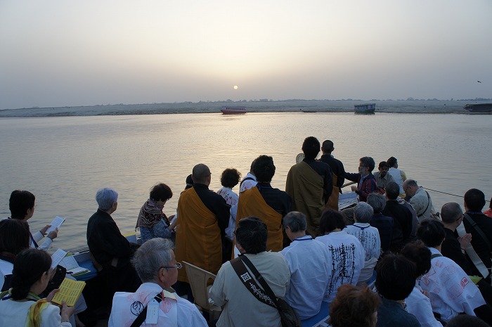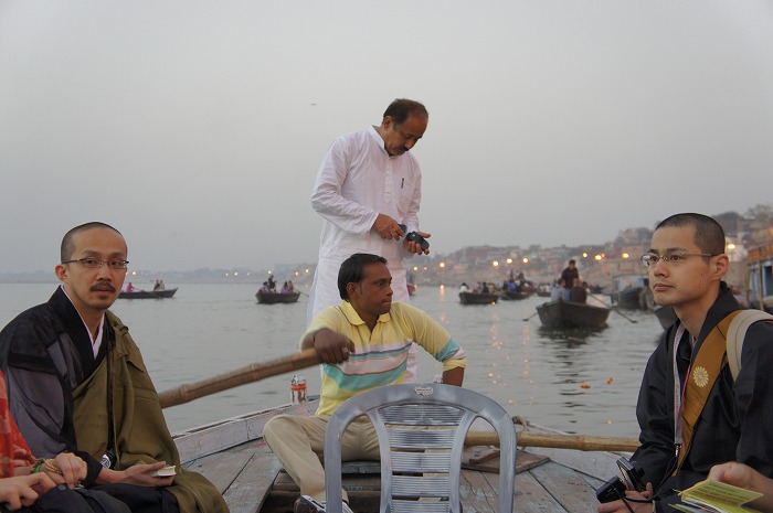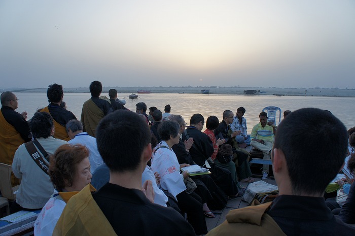 ガンジス河舟上にて、暁天唱題行並びに東日本大震災一周忌法要をお勤めするため、まだ日が昇らないうちにホテルを出発しました。