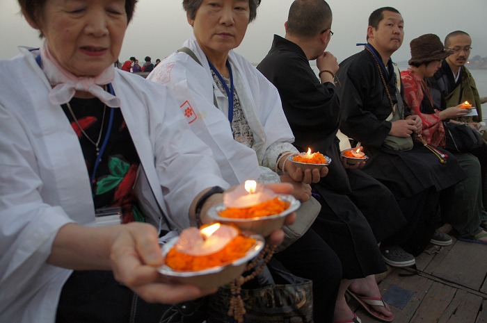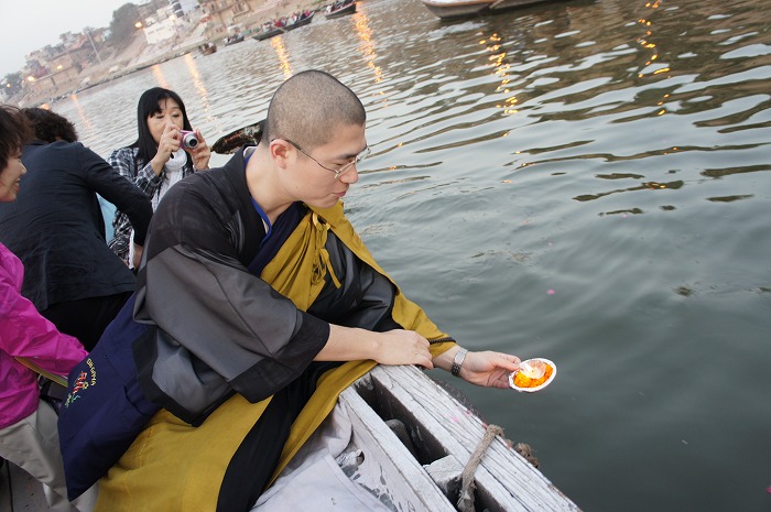 沖に出るまでの間、みんなに花の上に乗せられた灯明が配られました。舟からガンジス河に向けて献灯供養をするためでした。朝から灯籠流しをしているようで、少し不思議な気分でした。