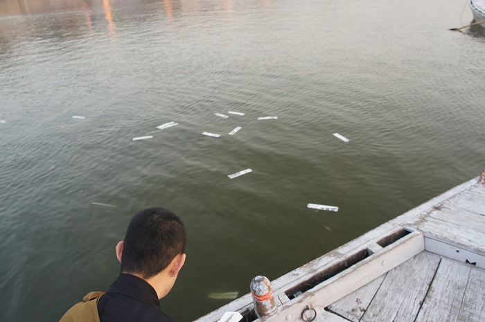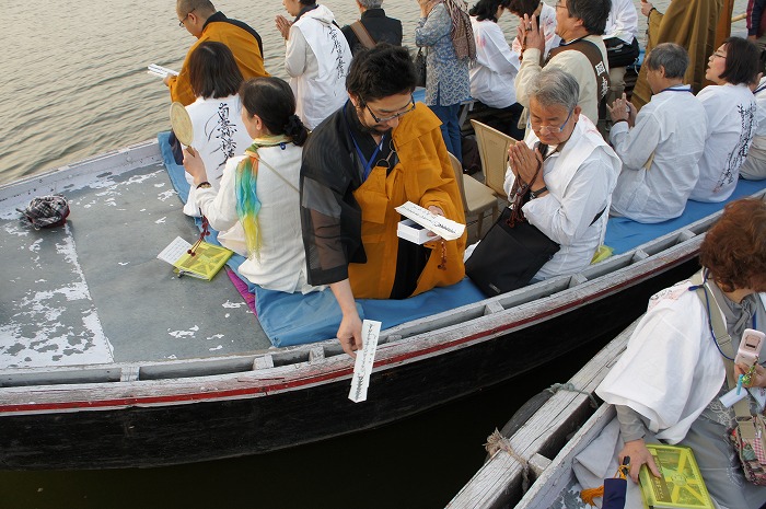 この日の舟は、厳粛に法要を行うためか、エンジンのない手こぎ舟でした。