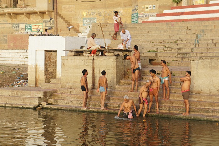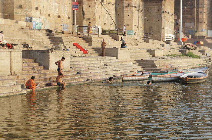 その途中、日本人の学生らしき青年が入ろうかどうか迷っていました。黙って参加者みんなで見守っていると…見事ガンジス河へダイブ。参加者からは拍手が起こりました。何とも立派な学生さん達でした。