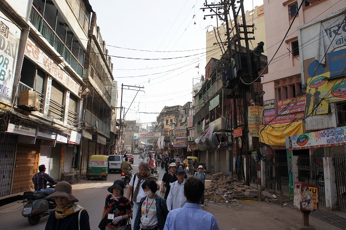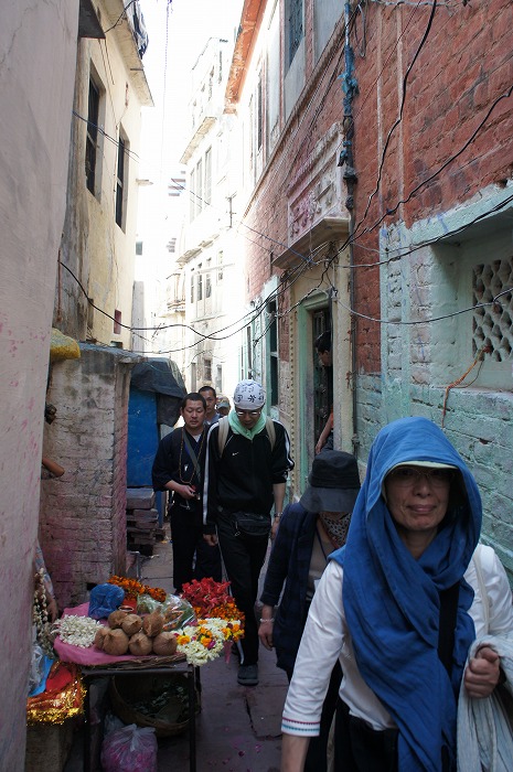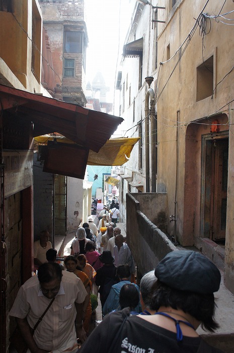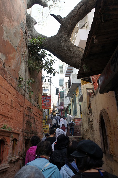 ガンジス河の近くは道が狭く、バスが奥まで入れなかったので、だいぶ手前からバスを降りて船着き場に向かいました。