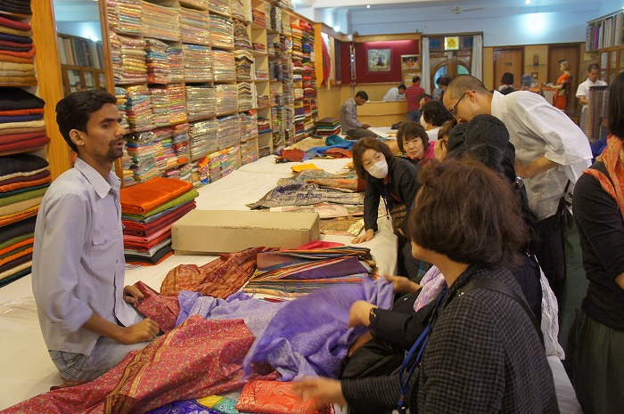 バスに乗り込みホテルへ戻る途中、インドのお土産として有名な、シルクのお店を訪れました。