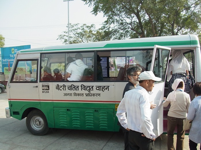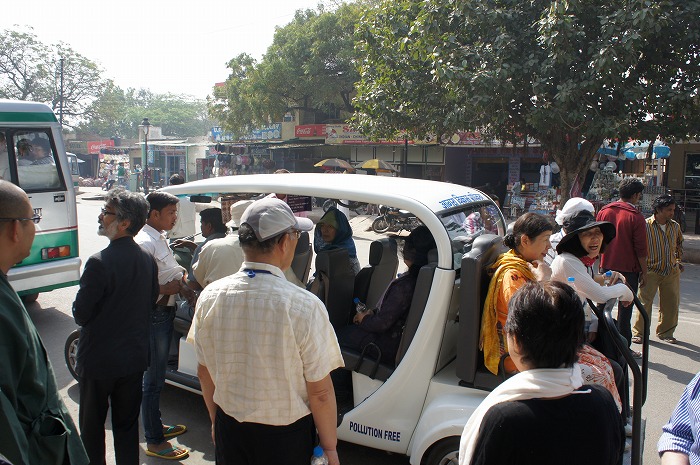 観光バスで行けるのはタージマハルから数キロ離れたところまでで、その駐車場からは電気自動車に乗り換えての移動になりました。排気ガスによる劣化を防ぐためだそうです。