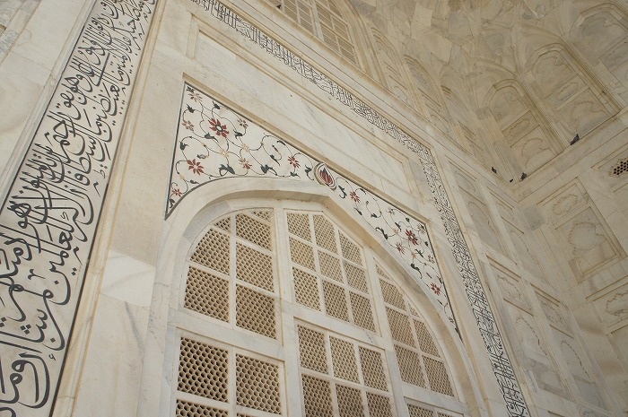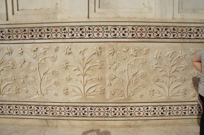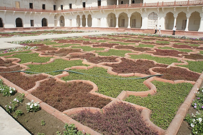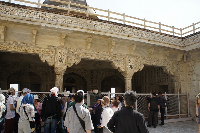 門から中に入っていくと、外とは様子がだいぶ異なり、タージマハルと同じく白大理石をふんだんに使った建物や、草花でデコレートした庭園があり、まさに王宮という感じの開放感ときらびやかさがありました。