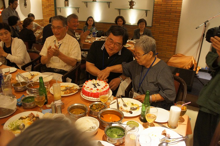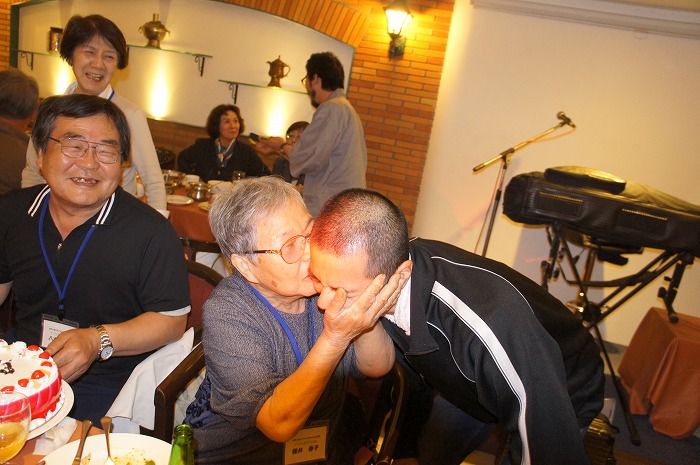 3月生まれのお二人にケーキのプレゼント。9日も一緒に過ごしたので、みんな一つになってお二人を祝福しました。最後には、最高齢の参加者からご褒美のキッス!!