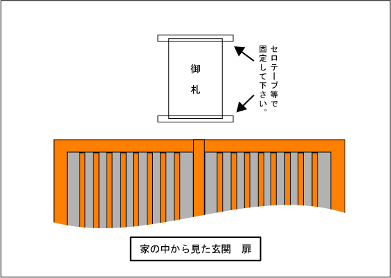 日々、仏様や神様に感謝するために、毎日、目にするところにお祀りして下さい。玄関またはお仏壇にお祀りすることをお勧めします。玄関にお祀りする際は、下の図のように、のりやセロテープなどで固定して下さって構いません。お仏壇にお祀りする際は、他のお軸などの邪魔にならないようにお仏壇の中の見える所に置いて下さい。