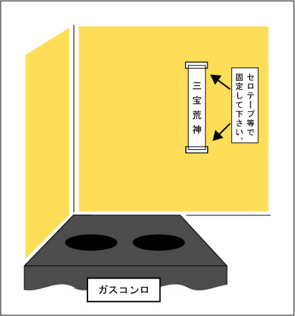 火伏せの神様と呼ばれ台所の神様です。火元の安全を心がけるように台所のいつも目にする所に貼り付けておいて下さい。風で揺れ動いたりすると危ないですので、大きな御札と同じように、のりやセロテープで上下をしっかり固定して下さい。